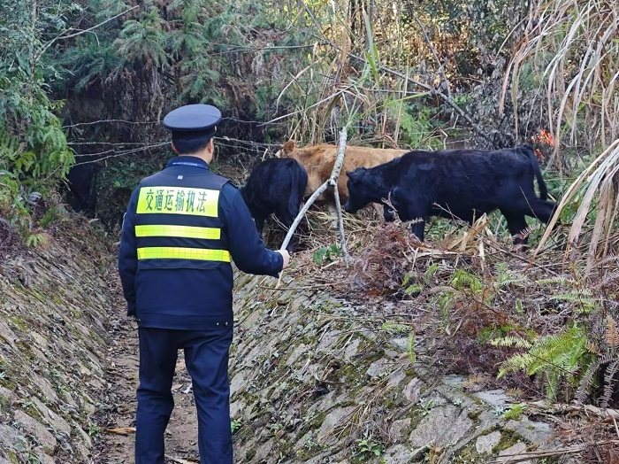 执法人员迅速抵达现场,此时一头黄牛滞留在车道边缘,身旁车辆呼啸而过,稍有闪失便可能引发事故。执法人员立即按规范布设警示区域、摆放安全锥桶,依托执法车鸣笛示警、喊话提醒,在疾驰的车流中筑起一道安全屏障。随后,执法人员将黄牛引导至路侧边坡临时管控。在对边坡进行延伸巡查时,执法人员又在草丛中发现另外四头耕牛。执法人员立即联动高速交警、养护部门,采取围堵与引导相结合的方式,经过近一小时紧张奋战,最终将五头牛全部安全驱离高速公路。