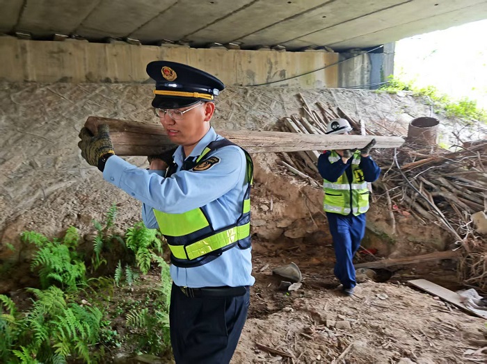 厦门:清理桥下违规堆放木板