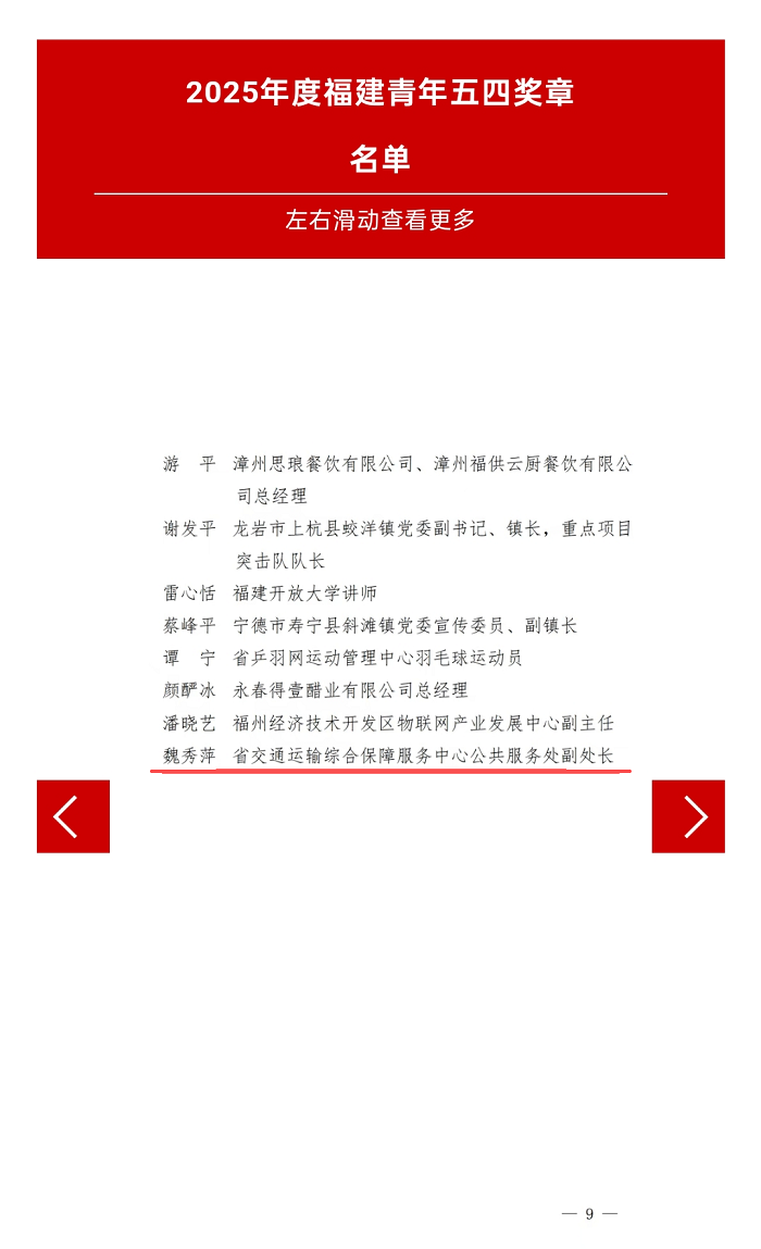 该奖项作为团省委、省青联授予我省优秀青年的最高荣誉之一,旨在表彰新时代青年在强国建设、民族复兴伟业中展现的精神品格与价值追求,魏秀萍同志始终以交通青年的坚守深耕主业,立足本职岗位,在工作中勇挑重担、冲锋在前,以实干实绩诠释了新时代交通青年的责任与担当。