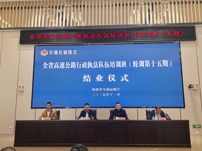 11月28日上午,全省高速公路行政执法队伍培训班(轮训第十五期)结业仪式在福州长乐举办,省厅执法监督局三级调研员卓辉、省交通保障中心副主任林森、省交通人资公司纪委书记吴超凡参加结业仪式并为受表彰的优秀学员和优秀组织单位颁奖。