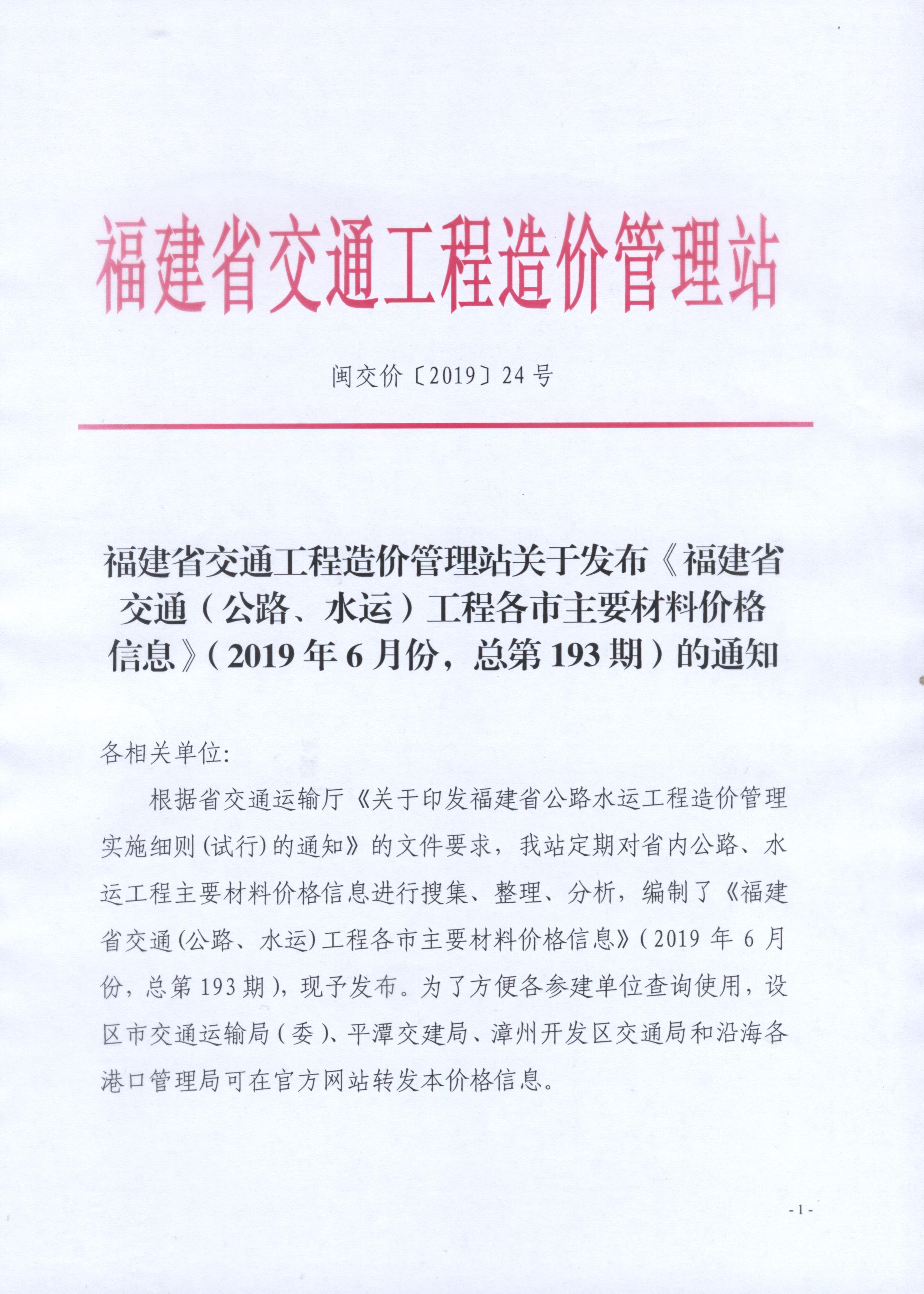 关于发布2019年6月份,总第193期《福建省交通(公路、水运)工程各市主要材料价格信息》的通知