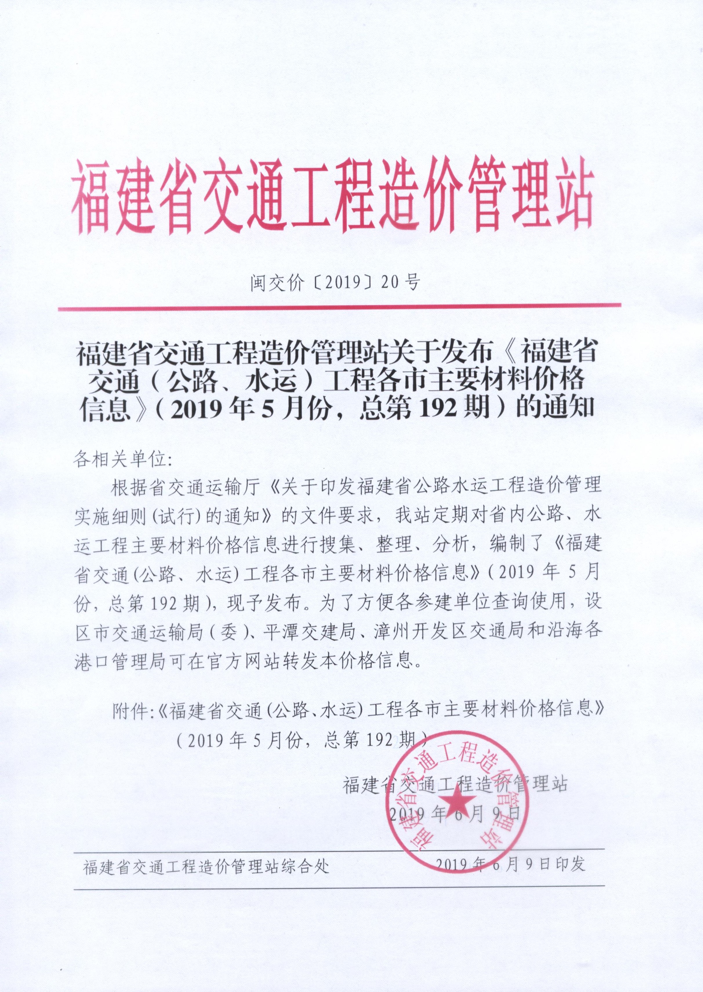 关于发布2019年5月份,总第192期《福建省交通(公路、水运)工程各市主要材料价格信息》的通知