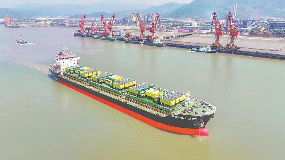13日,在宁德口岸青拓码头,巴拿马籍“康顺快运”轮顺利完成30辆由宁德制造的大型新能源矿卡装载作业,经宁德边检站高效办结出境边防检查手续后,开航前往共建“一带一路”国家印度尼西亚(如图)。