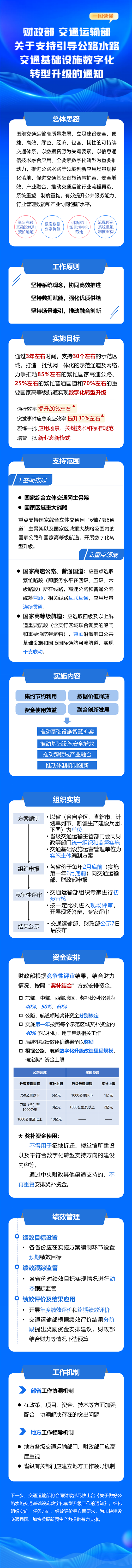 为深入贯彻落实中共中央、国务院关于加快建设交通强国、数字中国等决策部署,推进公路水路交通基础设施数字转型、智能升级、融合创新,加快发展新质生产力,财政部、交通运输部联合印发通知,决定通过竞争性评审方式支持引导公路水路交通基础设施数字化转型升级。