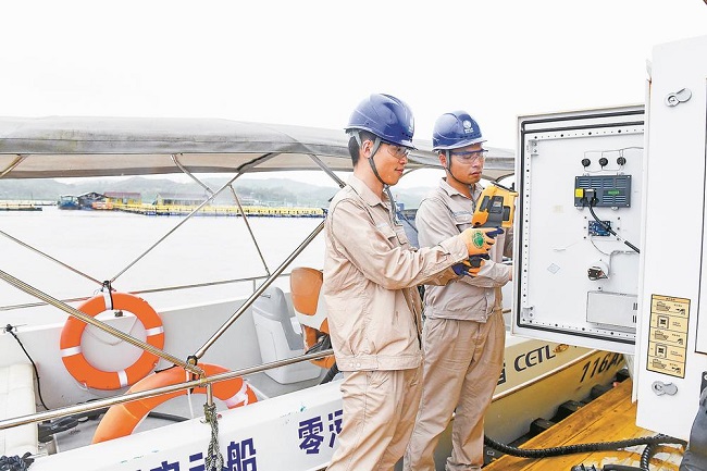 国网员工正在检修宁德沿海电动船舶快充设备。