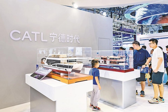 2025第三届中国海洋装备博览会上,宁德时代展出多款电动船舶模型。(本报记者 施辰静 摄)