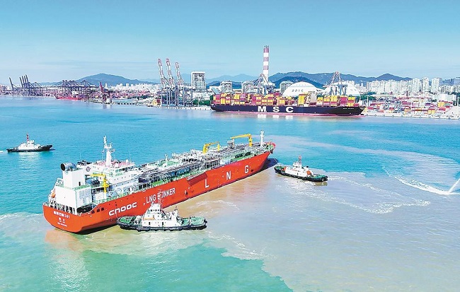 “海洋石油301”轮为靠泊在嵩屿集装箱码头的“地中海达莉亚(MSC DARIA)”轮加注保税LNG燃料。