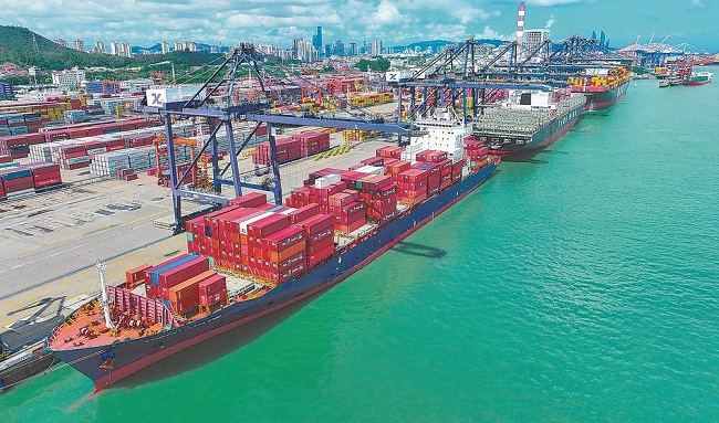 本报讯(记者 林梓健 通讯员 林若筠 李财兴 文/图) 桥吊快速起落,精准装卸集装箱;龙门吊有序转运,拖车往来穿梭不息……日前,厦门海沧港区国际货柜码头呈现出一片繁忙景象,3艘大型国际货轮依次靠泊作业(如图)——1号泊位366米长的“地中海处女座”轮、2号泊位306米长的“鲜明”轮以及3号泊位260米长的“以星奥克兰”轮依次排开,3艘货轮首尾相连近1000米,场面蔚为壮观。其中,“地中海处女座”轮和“以星奥克兰”轮执行南美航线,将经停秘鲁卡亚俄等重要港口;“鲜明”轮则驶往美国西海岸。
