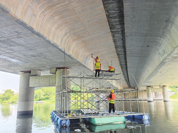 据悉,官浔溪桥与策槽总干渠桥均位于217省道同安大道上,分别于2015年、2011年投入使用。由于运营使用已久,加之受自然环境影响,两座桥梁的部分主梁、桥墩、桥台等部位出现了锈胀露筋、蜂窝麻面、混凝土掉块以及裂缝等病害。为确保桥梁安全运行,同安公路部门经现场勘察、病害分析,制定了修缮方案,并快速组织人员进场施工。针对官浔溪桥跨水作业,同安公路部门搭设了拼装式浮筒平台,方便施工队伍对梁底、排水口、桥梁等位置进行病害修复(如图)。
