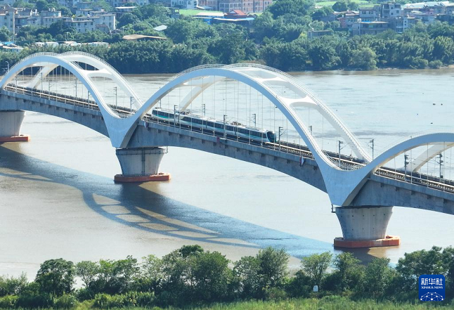 9月29日,列车通过福州滨海快线乌龙江大桥(无人机照片)。(新华社记者 林善传 摄)