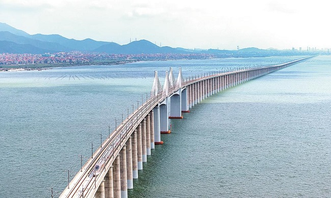 福建高速公路、铁路水平全国领先。图为2023年9月28日,高铁列车行驶过湄洲湾跨海大桥,我国首条设计时速350公里的跨海高铁——福厦高铁正式开通运营。(陈斌 摄)