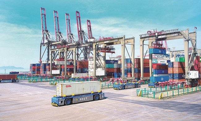 福建港口能级跃升,可常态化停靠世界最大的散货船、集装箱船、邮轮等船型。图为2023年5月25日拍摄的全国首个5G全场景应用智慧港口厦门远海码头。(施辰静 摄)