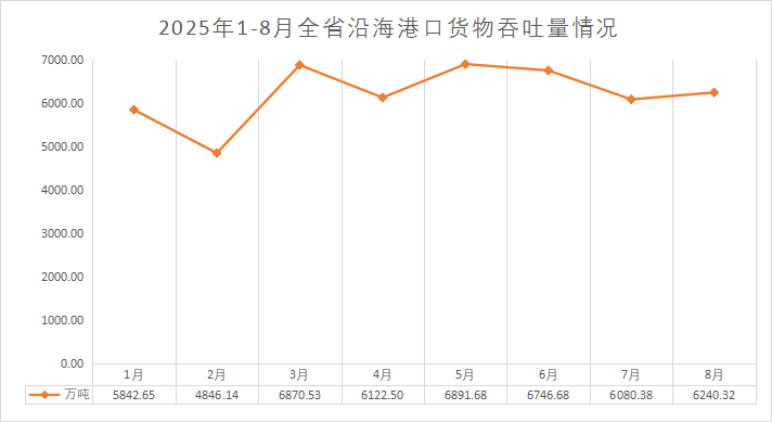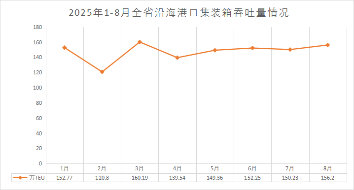 全省港口部门积极应对美国关税政策波动等不利因素影响,优化航线航班,加强腹地拓展,提升港口服务能级和竞争力,有效稳定港口生产。1-8月份全省沿海港口货物吞吐量累计完成4.96亿吨,同比增长1.9%,其中:集装箱吞吐量完成1181.34万标箱,与上年同期持平。