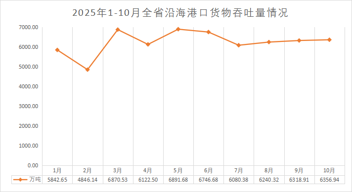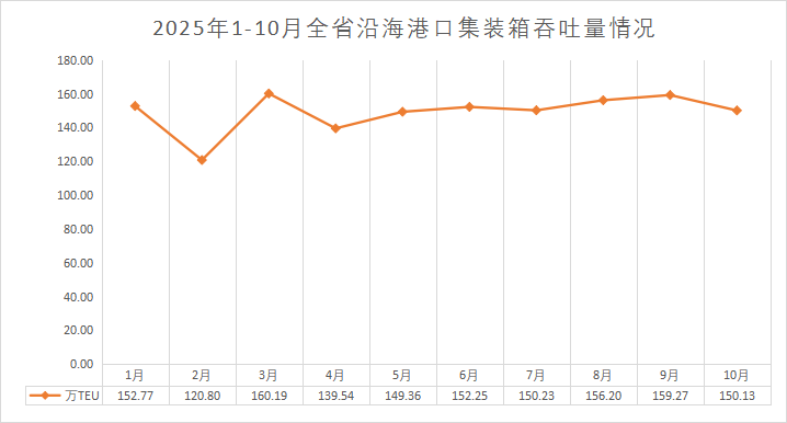 全省港口部门高效应对美国关税政策变化等影响,充分发挥“丝路海运”港航发展扶持政策效应,持续优化航线航班,巩固拓展内陆腹地,不断提升港口作业效率,有力促进港口生产回升。10月份全省沿海港口货物吞吐量完成6356.94万吨、同比增长3.8%,其中:集装箱吞吐量完成150.13万标箱、同比增长6.2%。1-10月份全省沿海港口货物吞吐量累计完成6.23亿吨、同比增长2.6%,其中:集装箱吞吐量完成1490.74万标箱、同比增长1.1%。