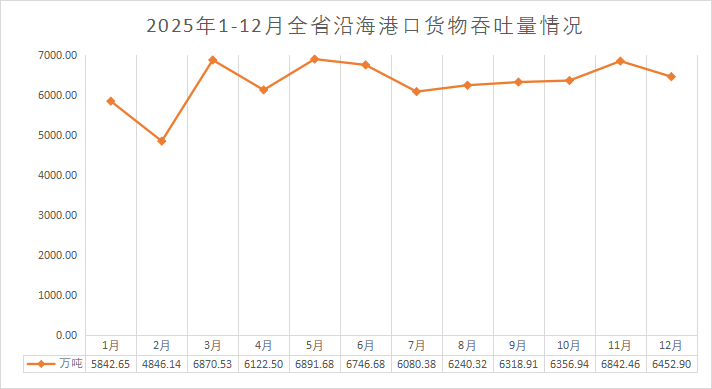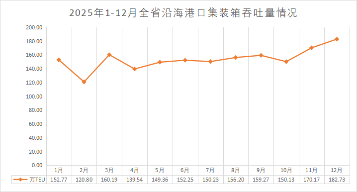 全省港口部门深化“丝路海运”港航贸一体化发展,不断拓展港口腹地,有效增强航线航班覆盖面与通达度,持续提升港口作业效率,有力促进港口生产稳定运行。12月份全省沿海港口货物吞吐量完成6452.90万吨、同比下降5.9%,其中:集装箱吞吐量完成182.73万标箱、同比增长4.7%。1-12月份全省沿海港口货物吞吐量累计完成7.56亿吨、同比增长1.6%,其中:集装箱吞吐量完成1843.64万标箱、同比增长1.8%。