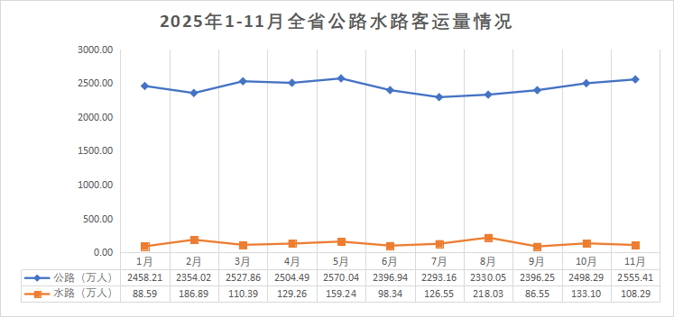 出行服务优质便捷,旅客运输平稳有序。11月份全省累计完成水路旅客运输量108.29万人、950.23万人公里,同比分别增长13.9%和12.2%;公路旅客运输量完成0.26亿人、10.41亿人公里,同比分别增长-2.5%和2.2%。1-11月份全省累计完成水路旅客运输量1445.23万人、11797.22万人公里,同比分别增长11.7%和14.3%;公路旅客运输量完成2.69亿人、106.83亿人公里,同比分别下降2.3%和2.0%。