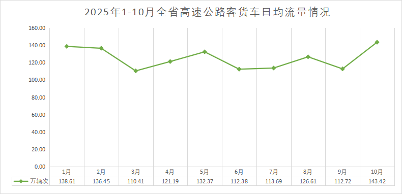10月份全省高速公路客货车流量4446.10万辆次,日均流量143.42万辆次、同比增长9.1%。1-10月份全省高速公路客货车累计流量3.79亿辆次,日均流量124.76万辆次、同比增长3.5%,其中:货车日均流量27.13万辆次、同比增长4.5%,客车日均流量97.63万辆次、同比增长3.2%。