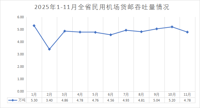 11月份全省民用机场旅客吞吐量完成438.84万人次、同比增长2.5%,全省民用机场货邮吞吐量完成4.78万吨、同比下降7.5%。1-11月份全省民用机场旅客吞吐量完成5038.33万人次、同比增长3.7%,全省民用机场货邮吞吐量完成52.40万吨、同比增长4.2%。