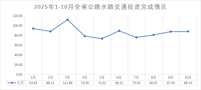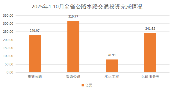 今年以来,全省交通运输部门抢抓施工黄金期,加速交通建设攻坚行动,加快重点项目推进实施。10月份全省公路水路交通投资完成88.10亿元、同比增长11.1%,1-10月份全省公路水路交通投资累计完成867.27亿元、同比增长0.5%,超序时进度3.4个百分点。其中:高速公路完成229.97亿元,超序时进度5.1个百分点;普通公路完成316.77亿元,与序时进度持平;水运工程完成78.91亿元,超序时进度4.3个百分点;运输服务等完成241.62亿元,超序时进度6.0个百分点。
