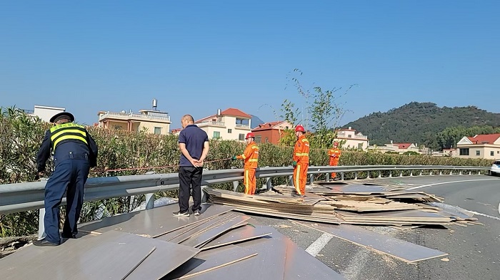 1月1日上午9点半左右,沙厦高速厦门路段的同安莲花收费站互通上,发生一起货车运载的橱柜木板掉落突发事件,四十余片的木板占用了应急车道与部分主车道,导致车辆无法通过。