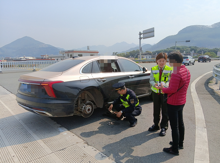 原来,赖先生一家四口从平和出发前往龙海,车辆行驶至收费站出口时突发爆胎,所幸车速不快,勉强驶出车道停靠路边。经检查,车辆右后轮轮胎严重破损,但因工具不全且缺少合适备胎,无法现场更换。执法人员迅速引导车辆至安全区域,安抚其情绪,并第一时间联系周边维修店协调救援。