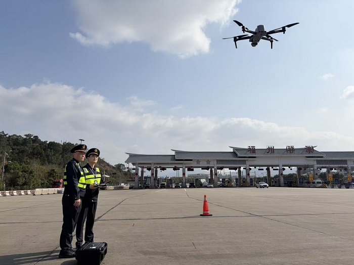 福州高速执法支队在祥谦收费站外广场组织开展执法检查行动,运用“空中巡查+现场核查”立体执法模式,以科技赋能精准治理“两客一危一重”等违法违规运输行为,全力护航高速公路安全畅通。