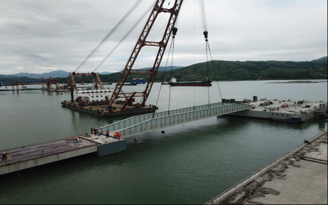 陆域开山具有作业面狭窄、爆破环境复杂、开采量大等特点,为确保施工安全,采用精细化管理,运用多台阶并进式开挖及压渣爆破;爆破施工过程中采用逐孔起爆技术,控制单段齐爆药量来减小爆破振动。环境复杂地段增大抵抗线、多打孔少装药,有效控制爆破飞石。为提高装载效率,减少二次破碎,项目优化爆破参数,降低大块率,加快出运速度。山场车辆往返日均6000车次,为保障交通安全,浇筑混凝土进山道路,两侧设置路灯、安全标志,现场配备应急管理人员,疏导交通、清理落石、救援故障车辆,让施工现场通行顺畅。