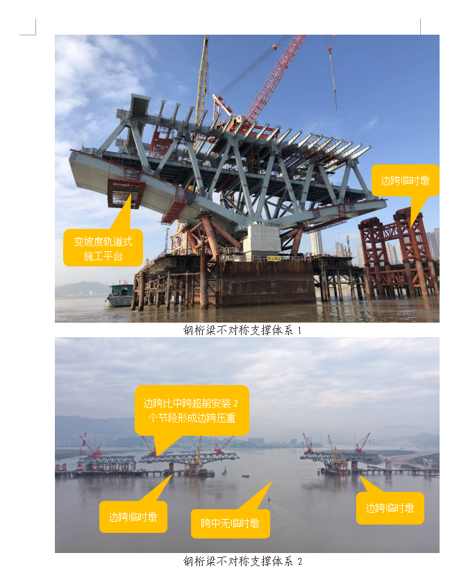 (二)通过对悬拼施工支撑体系各支撑作用机理及计算方法的研究,提出一种不对称大悬臂拼装支撑体系,降低了主航道通航风险,节省了中跨水中搭设临时墩的成本。