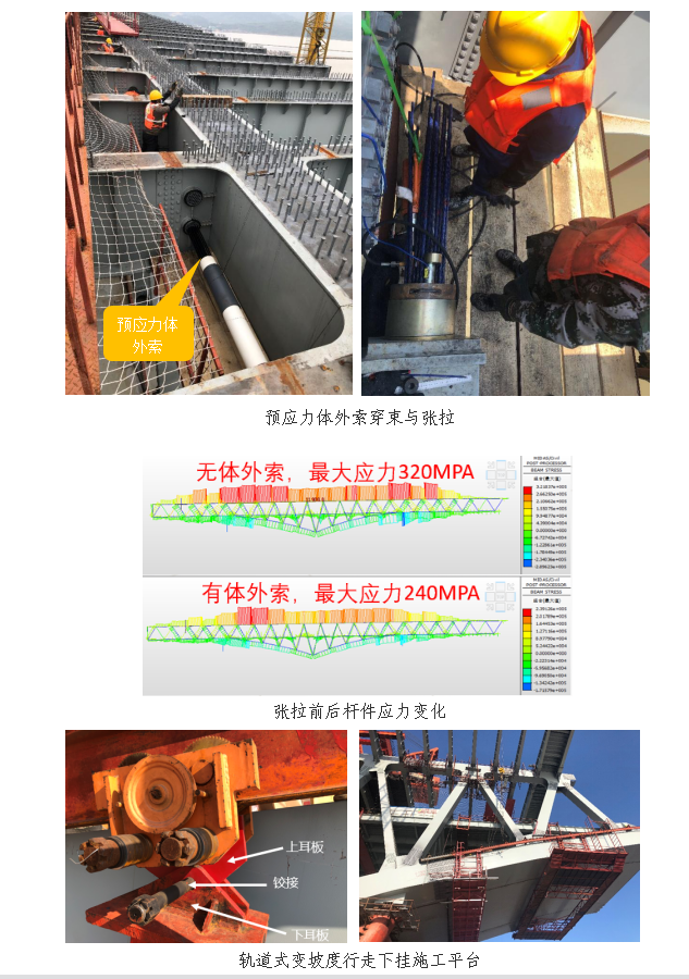 (一)首次采用水平体外索辅助变高度钢桁梁连续梁桥悬拼施工技术,解决了悬拼过程应力超限和变高段三角区的无应力合龙问题。因三角形桁架在主墩处无竖杆,无法直接设置扣塔+临时斜拉索,基于有限元分析结果,提出一种基于水平体外索辅助悬拼的施工工艺,节省了扣塔和临时竖杆的施工成本,降低了大悬臂抗台风险。