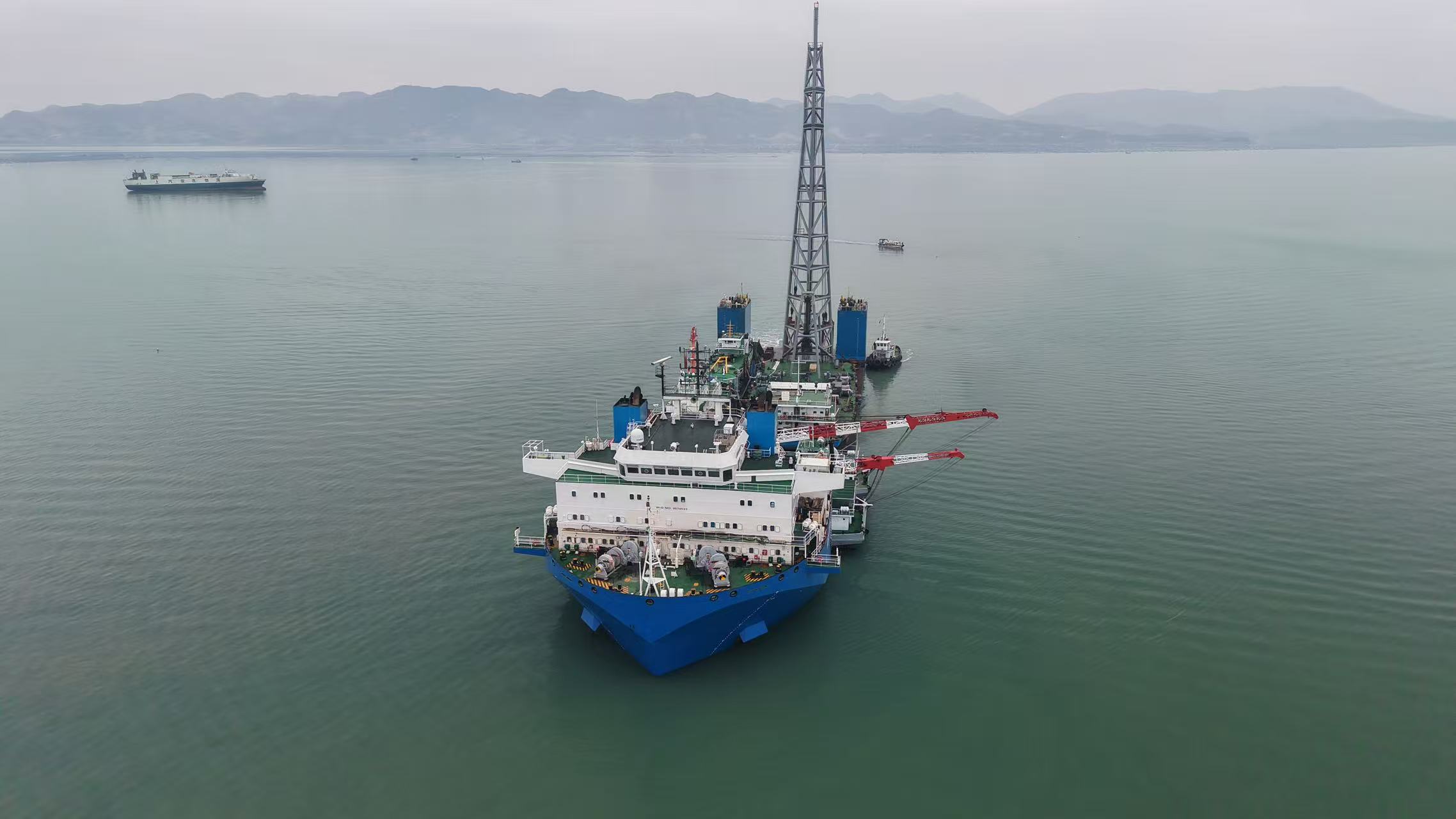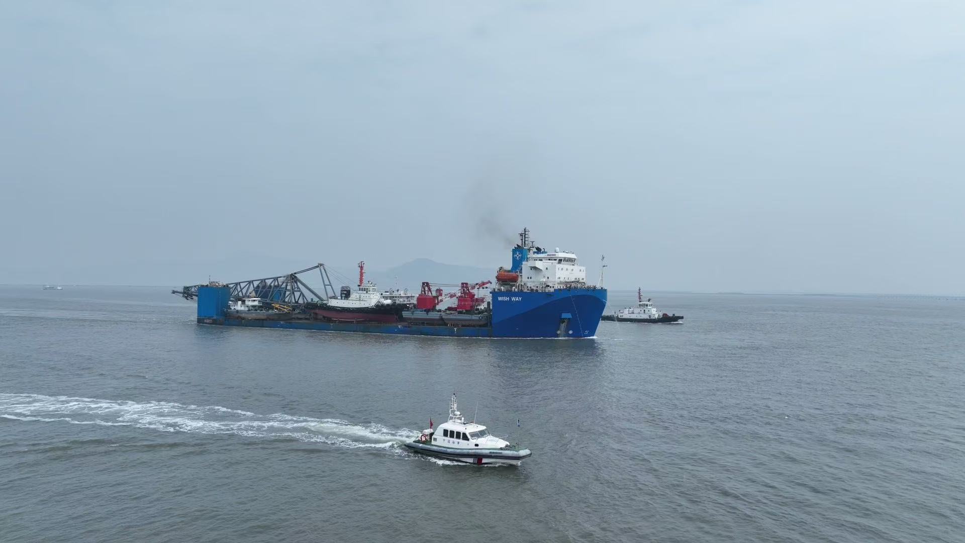 “希望之路”轮总长156米,最大潜深19米,是我国海工装备制造领域的重要成果。本航次,该轮采用组合式装载模式,一次性运载打桩船、起重船、抛锚艇及拖轮等5艘工程船舶,装载后总宽度达56米,左舷超宽20米、船尾超长44米,大幅超出常规通航标准,给船舶操纵带来极高挑战。