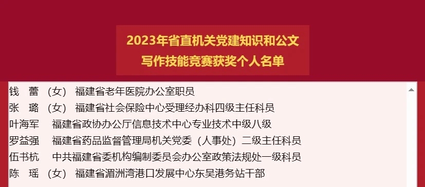 日前,由省委省直机关工委主办、省直机关工会工委承办的“奋进新征程 建功新时代”2023年省直机关党建知识和公文写作技能竞赛在福州开赛。我中心陈瑶同志在参赛的87个省直单位350余人中脱颖而出,荣获个人二等奖!