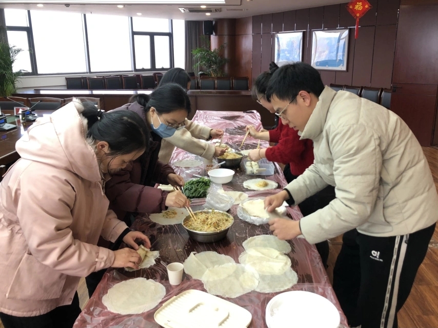 干部职工们现场一起动手,在圆薄的春卷皮内包入肉、香菇、冬笋、粉丝、韭菜等混合馅料,然后油炸至金黄,炸熟的春卷外形金黄似玉枕,寓意黄金万两,待稍微冷却入口之时,咬上一口便能发出“咯吱”的酥脆声。