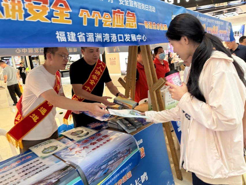 活动现场,路过的居民纷纷驻足、踊跃参加,兴化湾港务站工作人员通过咨询台为现场市民发放安全生产和常识小册子、宣传海报等材料,宣传港口安全、消防安全、防汛防台、应急避险等安全知识和自救互救技能。