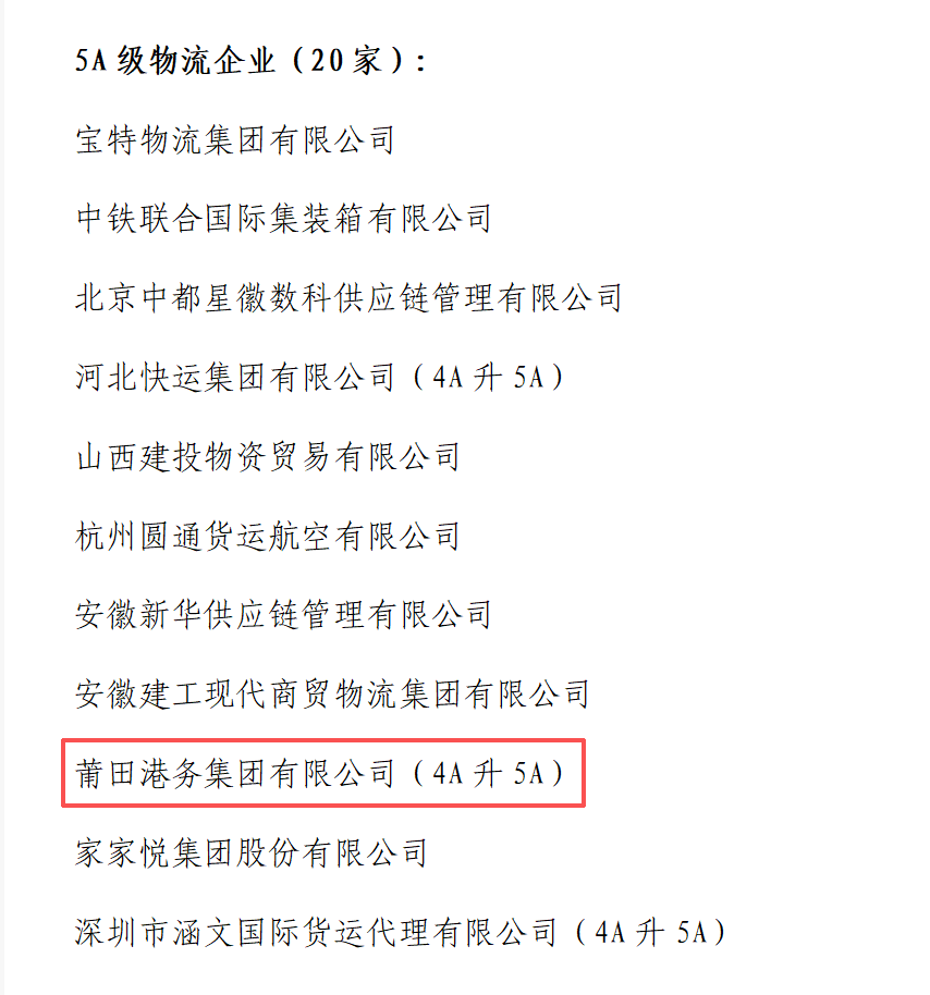 近日,中国物流与采购联合会发布了第41批全国A级物流企业名单,莆田港务集团有限公司获评“5A级物流企业”。