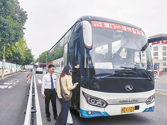 本报讯(报业集团记者 李妙珠 文/图) “这条专线票价实惠,站点覆盖广,前往厦门更便捷,下午返程票我都买好了!”11月3日上午10时许,漳州市民黄红在漳州市卫生职业学院南门,就近乘坐厦漳便民专线前往厦门访友。